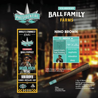 Your Presidential Blunt consists of Craft Indoor Flower Cultivated by the Legends of Living Soil, Ball Family Farms. The flower is then infused with Premium Distillate, using Presidential's Proprietary Infusion Process that enables us to permeate the flower to the stem. Finally, it is coated in the highest quality Kief. Bringing the culture, the strongest most flavorful Moon Rocks on the planet earth. Ground and rolled in a 100% Tobacco Free Blunt for your Enjoyment! Presidential is committed to creating the most innovative, highest quality cannabis products guaranteed to deliver a reliable and consistent dose with each use.
