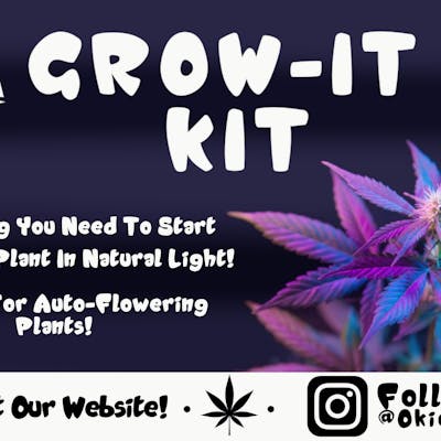 Oki Cannabis Grow-It Kit. Grow your own cannabis plant at home! Each kit is made to help beginner growers learn the basics of growing cannabis and advanced growers the basic needs to grow using natural light! Each kit comes with a house mix bag of soil and all the equipment needed to get started. Each kit is fully prepped with the following materials and supplies. Container For Seed Germination Rooting Solution Seedling Pot Wooden Plant Label and Support Coconut Coir (Large kit has 2) Pruning Scissors 3pc Mini Gardening Tool Set 3,5 or 7 Gallon Fabric Pot Spray Bottle Small Watering Can Oki House Mix Soil (just add water