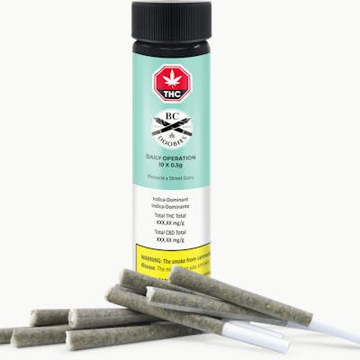 Daily Operation brings indica-dominant punch in a 10-pack of ready-to-spark doobies. A cross of Pinnacle and Street Guru, this cultivar lays down a steady rhythm of earthy spice, herbal depth, and a diesel undercurrent, with subtle sweet notes folded in. Daily Operation grinds out a flavour profile that stays intense from first light to final pull. Burning to a clean silver ash, these BC Doobies are smooth and sharp, carrying a pungent OG flare.