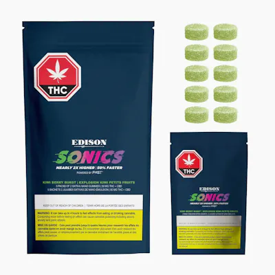SONICS Kiwi Berry Burst multi-pack sativa-dominant chews—powered by FAST™, proprietary nano-emulsion technology—deliver peak cannabinoid levels that are nearly 2x higher with a 50% faster onset. Each pack has five pouches inside with 10mg THC and 10mg CBD split between two gummies for a total of 50MG THC & 50MG CBD per pack. Delight in the lush flavours of strawberry, kiwi, and passionfruit with these rapid onset gummies.