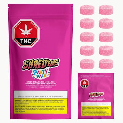 SHRED’ems Crazy Cream Soda Party Pack has 10 packs of mouth-watering MAX10 gummies, each with 10mg THC—for a total 100MG THC per pack! These sativa-dominant gummies are packed full of a classic soda pop flavour, with notes of cotton candy, vanilla and even a dash of coconut. To cap it all off these soda all-stars are vegan-friendly and made with all-natural flavours