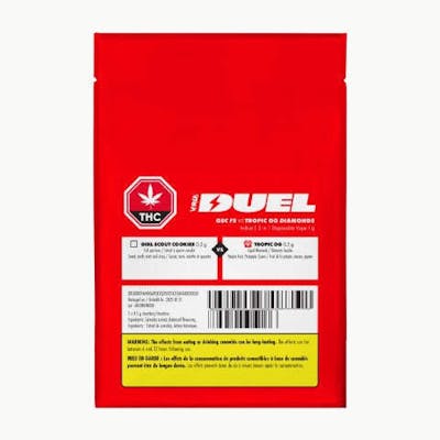Get ready for a flavour-packed faceoff with the Versus DUEL GSC vs. Tropic OG liquid Diamonds 2-in-1 Disposable Vape. In one corner, with 77-83% THC, Girl Scout Cookies full-spectrum cured resin delivers an indulgent blend of sweet, earthy flavours with hints of mint and citrus that only cannabis-derived terpenes can provide. And in the other corner, with 93-98% THC, Tropic OG liquid diamonds amplified by botanically derived terpenes, explodes with tangy pineapple, luscious passion fruit, and juicy guava.