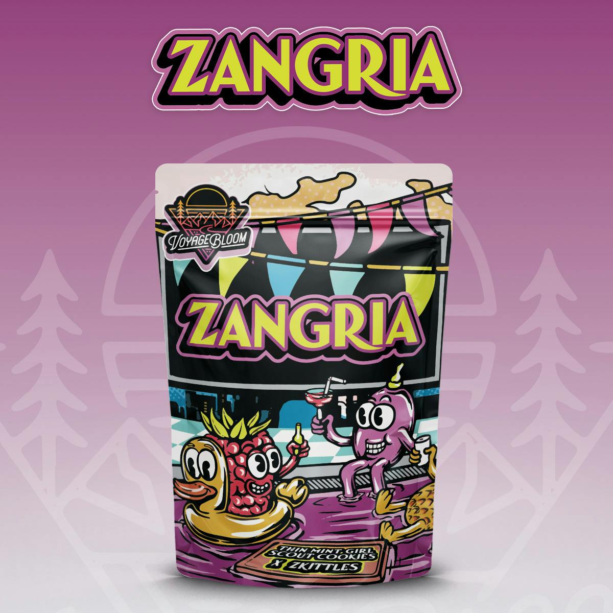 Thin Mint Cookie x Z Attributes: Rainbow Candy Cookie Dessert Origin: Fiya Farmer (clone) Zangria, a potent hybrid born from Thin Mint Cookies and Zkittlez. Elevate your high to new heights as this strain leaves you feeling weightless, as if floating on clouds. Its aroma bursts with sweet rainbow candy, accented by subtle hints of cookie dough, but make no mistake, this strain is not for the faint-hearted. Best enjoyed at night, Zangria's powerful punch of euphoria soothes nerves and induces calmness throughout your whole body, ensuring a restful night's sleep.