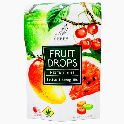 Ceres Cannabis Sativa Mixed Fruit Fruit Drops are hard candy edibles designed for social and or creative experiences. Strain/Effect: Sativa (uplifting, stimulating). Product Type: Hard candy (Fruit Drops). Flavor Profile: Mixed/Assorted fruit flavors. Dosage: 100mg Total THC per pack (10mg per piece). Onset/Duration: Edibles typically take 45 minutes to 2 hours to activate, with effects lasting 4-6 hours. Method: Ceres often uses Deep Water Culture (DWC) to grow high-grade, clean cannabis for their products.