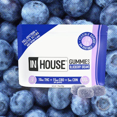 100mg THC/150mg CBD/50mg CBN. 20 Servings, 1 Serving = 1/2 Piece. Customize your experience with InHouse and enjoy our quality cannabis - From our house to yours. InHouse Gummies are full-spectrum, fast-acting sweet treats available in delicious flavors and unique ratios of THC and a variety of cannabinoids for whatever experience you choose. With an onset of 15 minutes, our sugar-coated gummies are vegan & gluten-free, naturally flavored and colored with real fruit juice, and made without preservatives or high-fructose corn syrup.