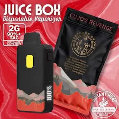 Infused Sativa – Strawberry Watermelon x Coconut x Pink Panther Live Terps A beast of a vape — juicy, tropical, and ready to bite. Cujo’s Revenge charges in with a tidal wave of ripe strawberry and watermelon candy before crashing into a smooth, creamy coconut finish. Then the live Pink Panther terps snap into place, adding a Sativa kick that doesn’t back down. Flavor Vibe: Tropical fruit chews with a smooth, sun-baked exhale Feels Like: Running wild. Loud playlists. Sunrise mayhem We took everything you love about Northern Grown’s boldest flavors and gave them a new home — inside our ultra-premium 2-Gram JUICE BOX Disposable Vaporizer. Built with the BB Tank SCM Pod, it features an Instant Wickless Ceramic Heating Core, NO exposed metals to oil, and Smart Temp Control for smooth, high-potency hits from the first rip to the last drop. PLUS enjoy an easy-to-read LED Battery Indicator, Inhale-Activated Vapor Production, and Button-Fired Pre-Heating to kick clogs to the curb. Each JUICE BOX is powered by a 350mah Battery with Fast USB-C Charging, and loaded with Potent 90%+ Distillate and Northern Grown's Dubious Triple-Terp Blends: Two natural flavor profiles and one Live Resin terpene for real strain character, unmatched depth & effect.