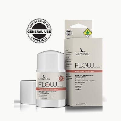 Easy to use and mess-free, this cocoa butter spice topical stick is designed to provide warming, soothing relief whenever (and wherever) you need it. Cocoa butter, terpenes, proven herbal extracts, and our unique Canna Vera combine with 900mg cannabinoids to help you feel the FLOW. What is Canna Vera? Canna Vera is a unique-to-Fairwinds extract that allows the full effects of cannabis to shine. Comprised of polysaccharides, lipids, and waxes juiced from the cannabis plant, we use Canna Vera in our FLOW topicals for its consistency (similar to Shea Butter) and because it delivers a noticeable difference in effects. Ingredients: Topical Base Blend (Cocoa Butter, Beeswax, Vegetable Glycerin, Sorbitan Stearate), Dimethyl Sulfone [MSM], Camphor, Docosanol, Essential Oil and Terpene Blend (Wintergreen, Lemon, Cinnamon, Caryophyllene), Cannabis Oil Blend (THC, CBG, CBD), Maltol, Canna Vera. Potency: Per Stick: 300mg CBD, 300mg THC, 300mg CBG How to Use: Apply over affected area; effects are typically felt within 5 minutes. Reapply as needed. Store in a cool, dry place. Product may soften at higher temperatures.