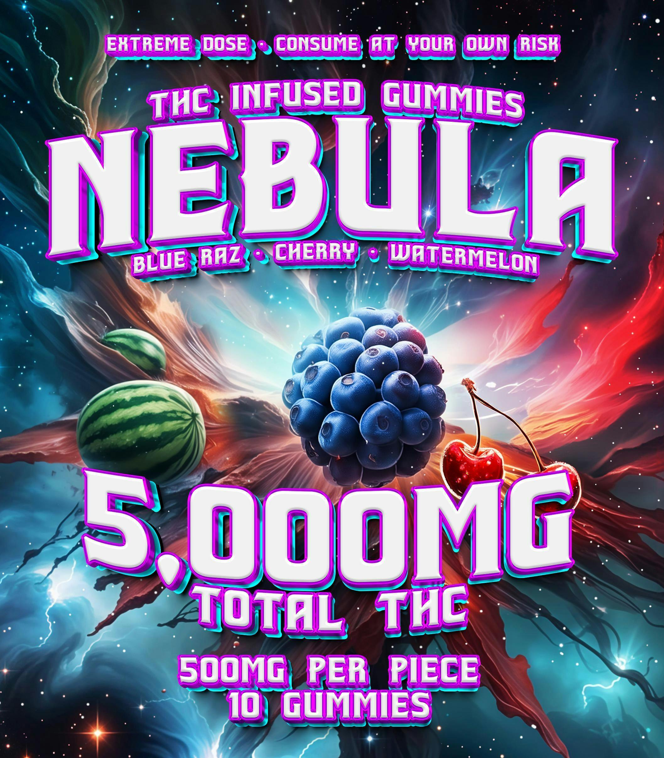 Nebula 10,000mg Variety Gummy - Blue Raz - Cherry - Watermelon
