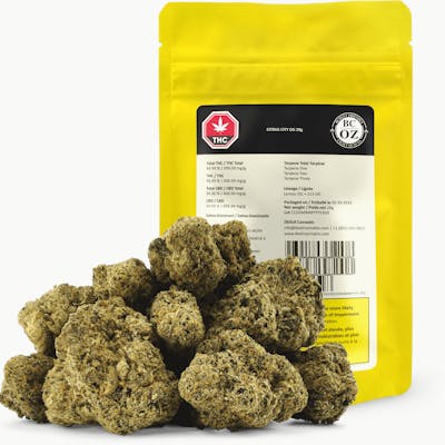 Citrus City OG, born from Lemon OG and 213 OG, is a sativa-dominant, BC-grown cultivar that comes in with a rush of lemon and floral lavender tones riding a spicy pine breeze. The buds glow with sun-bright greens and amber highlights, all packed into an iconic 28g yellow bag.