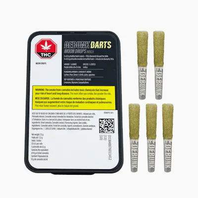 Up your game with DEBUNK Triple Infused Moon Drops Darts, a mellow indica-dominant that delivers a full serving of lychee and pear, hints of juicy citrus and berries. This 5-pack of darts are bubble hash coated and infused with THCA isolate, hydrocarbon extracted distillate, and botanical terpenes for maximum flavour and potency. With high-quality milled flower in a classic half-gram format, this cross between Purple Urkle and Do-Si-Dos comes in at 40% THC, delivering a pack of bold, premium pre-rolls built to hit harder