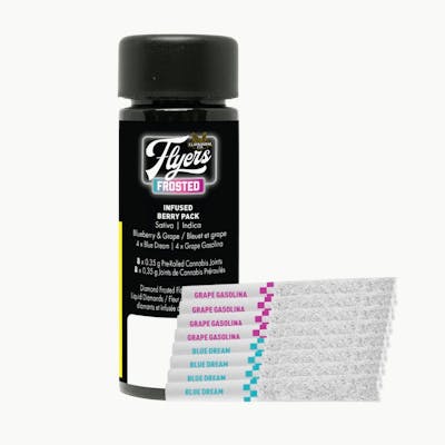 Frost Around & Find Out! These super tasty eight 0.35g pre-rolls are THCA diamond frosted, enhanced with botanical terpenes, flavouring agents, and made from premium flower infused with liquid diamonds. Each Frosted Flyer is highly potent and packed with nonstop flavour all the way down to the crutch. This variety pack features four 0.35g Blue Dream and four 0.35g Grape Gasolina.