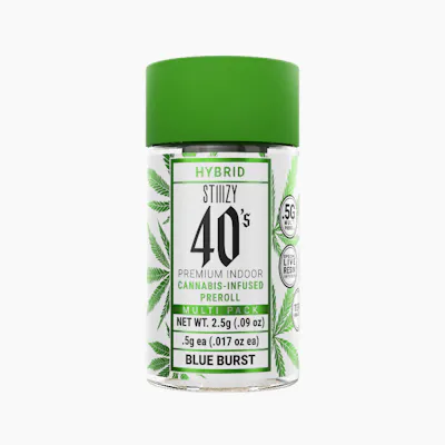 Stiiizy is setting the standard in the pre-roll game with the most revolutionary and innovative products. Elevate your pre-roll game. Stiiizy 40s pre-rolls are setting the standard with high potency, cannabis infused joints coated evenly with kief. Using our proprietary live resin infusion methods, we’ve designed every pre-roll to offer 40%+ THC potency with a unique flavor profile. With a smooth inhale and tasteful exhale, each and every Stiiizy 40 is packed with indoor grown flower, specifically made to ensure a potent and long-lasting high. Spark up the 40s. BLUE BURST / HYBRID Taste: Blue Raspberry Description: Named for its delicious and powerful flavor, our Blue Burst 40s are known for its blue raspberry flavor with hints of citrus on every exhale. Blue Burst 40s will have you taking flight on a balanced and pleasant cerebral high. Feeling: Relaxed, Uplifted, Creative