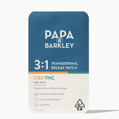 "CBD-rich transdermal patch designed to support persistent joint and muscle comfort. The 3:1 Releaf Patch features higher levels of CBD and lower levels of THC, promoting healthy joint function and mobility. Transdermal patches are fast-acting and continuously release cannabinoids into the bloodstream, providing up to 12 hours of targeted support. This patch does not typically cause a high and is suitable for all cannabis consumers, including beginners. Crafted with skin-soothing ingredients like jojoba and avocado oil, these patches offer a slow-release, easy-to-apply, single-use solution. Papa & Barkley’s patches contain whole-plant, solventless cannabis oil and are made using our signature solventless, chemical-free infusion process to preserve the plant's full spectrum of cannabinoids, terpenes, and phytonutrients for maximum benefits. Our patches are hypoallergenic, water-resistant, and designed with a strong adhesive to prevent leakage.