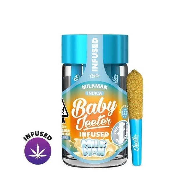 Milkman - Indica Milkman, an indica, offers a dry hit with sweet cereal notes and cream. Upon inhale, experience the flavor of captain crunch, while exhale reveals sweet creamy cereal milk notes. The high is balanced, slightly more body-leaning, felt initially in the face, then pulsing lightly through the body, while the mind stays relaxed and focused. Effects: Focused, Relaxed Pocket-sized vibes. Our 5 pack of Baby Jeeters is great for sharing with friends...or not. We won't judge. In each jar, you'll find a hand crafted, hand rolled 5 0.5-gram Jeeter joints. They're made with premium indoor grown flower, infused with Liquid Diamonds in California and Michigan or distillate oil in Arizona, and dusted in kief. 5-minute burn time each.