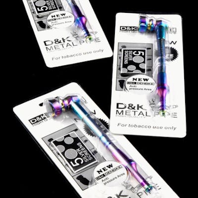 Metal pipe gift set. Includes rainbow metallic metal pipe with decal design and five metal pipe screens. Designs may vary. Approximate size (pipe): 3.5" Approximate weight (pipe): 15g