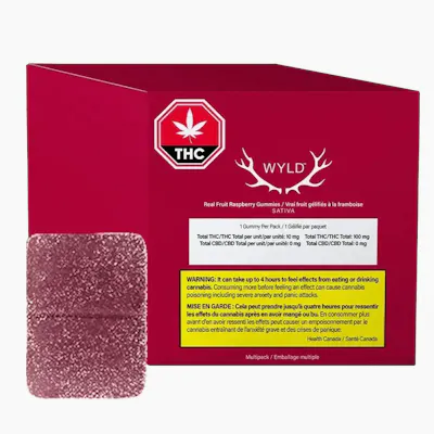 This multipack contains 10 immediate containers, each with one soft chew-for a total of 10 soft chews. Wyld Raspberry Sativa Enhanced THC gummies are sustainably made using real fruit, botanical terpenes and natural flavours. Each gummy contains 10mg THC, for a total of 100mg THC per pack. All Wyld gummies are packaged in a fully compostable pouch, and our recipes are formulated by food scientists to provide consistent experiences that taste amazing. Wyld gummies use sunflower lecithin to improve bioavailability and onset time and are made to be thermostable up to 55 degrees celsius, with a firm texture that doesn't stick to your teeth. Each Wyld Raspberry Sativa Enhanced gummy contains the terpenes limonene, valencene, beta-caryophyllene, alpha-pinene, and beta-pinene for an energetic and uplifting experience.