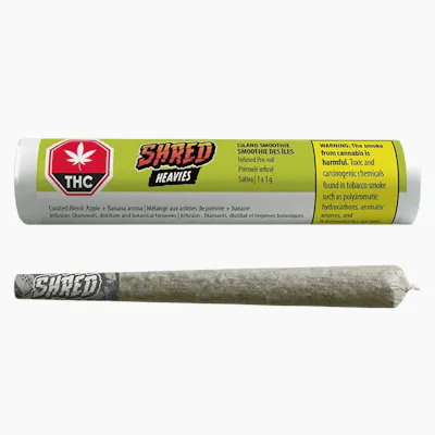 The first-ever 1g SHRED Heavies pre-roll-now blasting off with a brand new flavour: Island Smoothie. This bold beauty is packed with island fruit flavour and infused with diamonds, disty, and terps for a smooth, potent burn that hits at 50% THC. Whether you're flying solo or passing it around, this hefty joint brings big-time fruit and big-time fire. Not for lightweights.