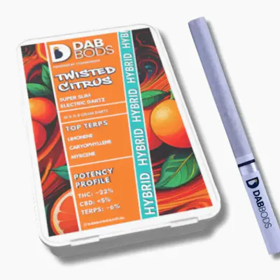 Dab Bods Twisted Citrus Super Slim Electric Dartz offer a refreshing twist on traditional pre-rolls. These slim, cigarette-style pre-rolls are expertly crafted and infused with botanical terpenes, delivering an extra burst of citrus flavor with every puff. Perfect for those who enjoy a smooth, flavorful experience, the Twisted Citrus Dartz offer a zesty, citrusy taste that's as bold as it is refreshing. Ideal for on-the-go enjoyment, these sleek pre-rolls provide a modern, flavorful alternative to your usual smoke.