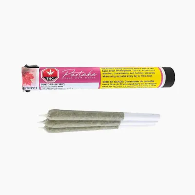 A premium pre-roll offering from Partake that brings you three perfectly packed 0.5g joints of pure indulgence. Designed for those who crave flavor-forward, high-quality flower in a convenient and consistent format, these pre-rolls are crafted from 100% whole bud - never shake, never trim - and rolled to perfection for a smooth, even burn every time. Pink Drip is a boutique, indica-leaning hybrid cultivar known for its stunning bag appeal and rich terpene profile. A genetic descendant of Pink Rozay and Gelato 41, this strain is as pretty as it is potent. The buds are visually striking, showcasing deep purple hues drenched in a thick layer of sticky trichomes and vibrant pink undertones - hence the name. The aroma is intoxicatingly sweet, offering a decadent blend of berry sorbet, floral creaminess, and a touch of citrus zest. Upon inhale, users can expect layers of flavor: sugary fruit, gassy undertones, and a faint herbal kick on the exhale. The effect? A calming, euphoric high that hits both body and mind, ideal for evening sessions or those wind-down moments when relaxation is key.