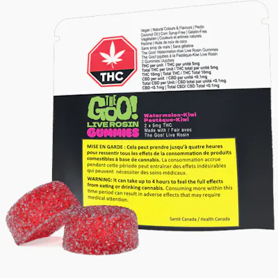 The Goo! Watermelon-Kiwi Live Rosin Gummies are made with 100% solventless The Goo! Live Rosin, delivering a superior gummy experience crafted from full-spectrum, high-quality inputs. Made with premium ingredients like pectin and coconut oil, these gummies are free from gelatin and corn syrup, making them both vegan and gluten-free. With refreshing watermelon and a kiwi twist, they offer a sweet fruit flavour that's a pleasure to enjoy. Packaged in a sleek, compact pouch, they offer great value and a higher-quality gummy experience with every bite.
