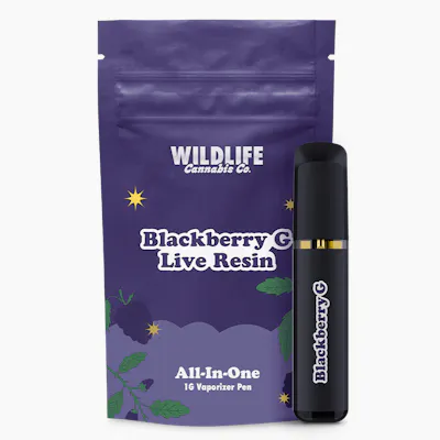 Seeking a true pure live resin vape? Wildlife's Blackberry G Live Resin All in One Vape packs a serious punch of true to strain flavour with no additives, flavouring or fillers. Made from indica dominant single strain fresh frozen cannabis, enjoy the full expression of the flower's terpenes and cannabinoids resulting in a sweet intersection of flavour and potency. Packaged in our 1g, breath activated premium all in one vape hardware for smooth and consistent full-spectrum hits with ease. Ultra discrete, convenient and rechargeable, the Wildlife Blackberry G AIO Live Resin Vape has been designed to optimize flavour and deliver reliable air flow every time. While terpenes will vary by lot this strain often has a myrcene, limonene, caryophyllene and farnesene dominant profile.