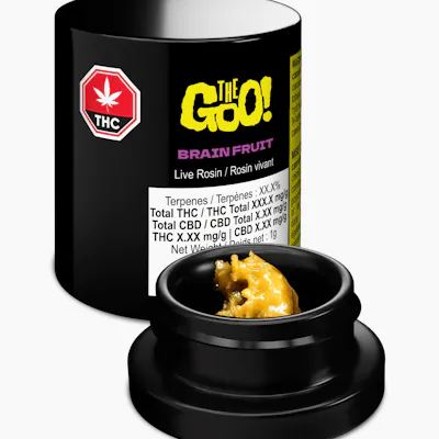 The Goo! Brain Fruit provides an intensely fruity and cerebral live rosin experience, created in Alberta using a 100% solventless process. The process includes: 1) Selection of fresh-frozen flowers for their aroma and quality, 2) Ice-water extraction without any solvents, 3) Freeze-drying, 4) Low-temperature rosin press, and 5) A cold cure and whip process. There are no solvents, additives, flavourings, or distillates used. This ensures a pure, 100% true live rosin, made by experts for a superior experience.