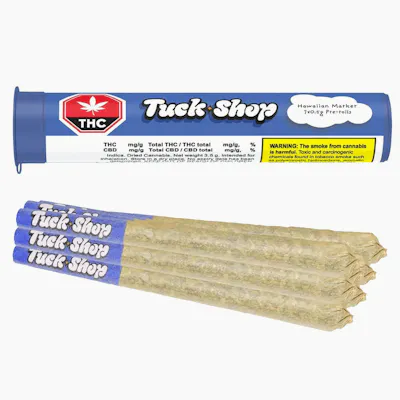 "Colour outside the lines with Tuck Shop's Hawaiian Marker. This loud, tropical strain is a cross of Hawaiian Rain and Permanent Marker, bursting with bold notes of fruit, creamy gas, and just a pinch of floral funk. Each pack has 7 slim, hand-finished pre-rolls made from premium flower-never trim-packaged with a humidity pack for lasting freshness."