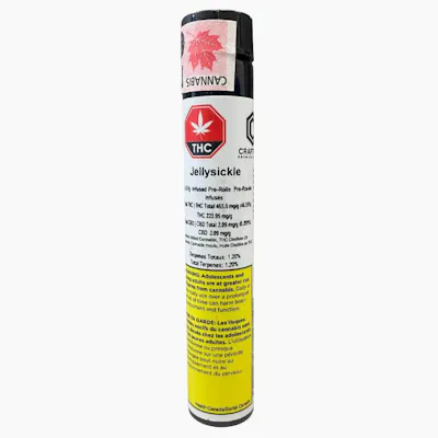 Craftport Cannabis' Jellysickle Infused 2 x 0.9-gram straight-style cowboy cut pre-roll pack is the perfect infusion of liquid diamonds with premium British Columbia bud to form a premium pre-rolls that tastes like no other. These infused pre-rolls are between 50-56% THC.