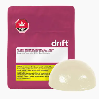 Drift Pomegranate Berry Glitch is a single unit of high-potency, fruit-flavoured chewable extract infused with 10 mg of evenly dosed THC and delicious, sweet-tart flavours of pomegranate and berry. Thanks to our state-of-the-art emulsification process, you can enjoy your experience with very minimal, if any, cannabis taste or smell.