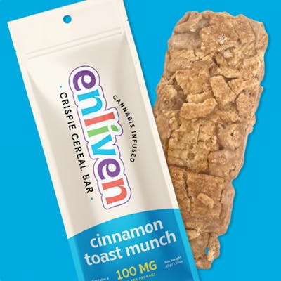 Enliven is excited to offer Cinnamon Toast Munch Bars, made with crunchy Cinnamon Toast Crunch cereal squares, gooey marshmallows, and swirls of cinnamon. Each bar contains 100mg THC from premium hybrid distillate, offering a flavorful and enjoyable experience. The bars are sectioned into five pieces for easy portioning. -- Ingredients: Gluten Free marshmallows, cinnamon toast cereal, shortening, rice cereal, cinnamon, cannabis distillate Contains wheat and soy