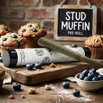 Stud Muffin is a 65% Indica-dominant hybrid strain bred by Jinxproof Genetics from a cross of Super Lemon Kush and 9LB Hammer. It is known for producing heavy yields with a sweet, lemon-grape aroma and providing intense, sedative, and muscle-relaxing effects. It is often used to treat pain, insomnia, and for deep relaxation.
