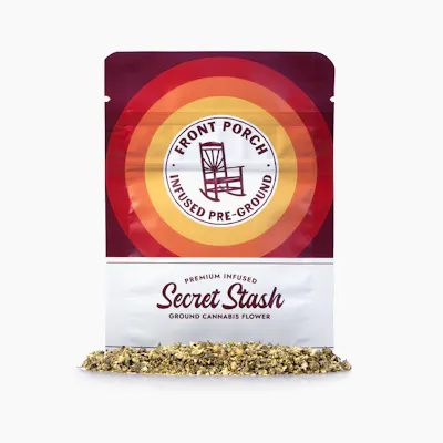 Front Porch – Secret Stash (3.5g Infused Pre-Ground Flower) A potent blend of premium cannabis flower and rich crumble wax, finely ground and ready to roll, pack, or bowl. This small-batch infusion delivers the elevated experience of an infused pre-roll — now in bulk form. Convenient, powerful, and crafted for smooth, flavorful sessions every time. This product is made from a curated mix of strains, so while it’s not labeled strictly as indica, sativa, or hybrid, it leans balanced and versatile — great for guests seeking anytime effects. • Type: Infused Pre-Ground Flower • Weight: 3.5 grams • Infusion: Crumble Wax • Form: Resealable pouch • Strain Profile: Blend – Balanced & Anytime-Friendly