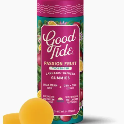 Take your mellow to the next level with Good Tide Passion Fruit THC:CBD:CBN gummies. An Indica single-strain rosin is enhanced with an extra dose of CBN and CBD’s relaxing properties and the tropical delight of passion fruit flavor to help you sway into the perfect hammock nap.? -- 10mg THC:CBD:CBN per gummy, 100mg THC:CBD:CBN per container. -- Made with fully compostable packaging!