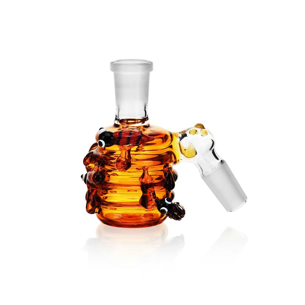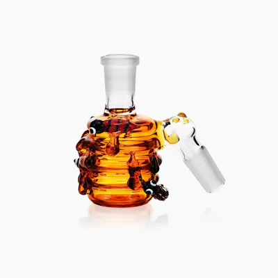 Introducing the 3.1" Arsenal Golden Hive Ash Catcher, a whimsical yet functional addition to your smoking setup. Inspired by the enchanting design of a honey pot adorned with charming bees, this ash catcher not only looks delightful but also effectively captures ash and debris to keep your water pipe clean. Crafted from high-quality borosilicate glass, it offers durability and long-lasting performance. Available in an array of vibrant colors, the Golden Hive adds a touch of sweetness to your collection. Featuring a 14mm female joint, it seamlessly attaches to most bongs, and the included 14mm male bowl ensures you’re ready for a smoother, cleaner hit.