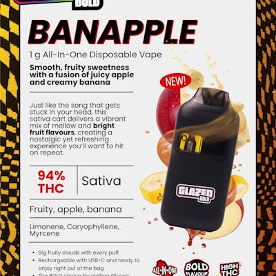 Bold Glazed Banapple Sativa Disposable delivers creamy banana and juicy apple clouds with THC and terpenes like limonene, myrcene, and caryophyllene. Fruity, smooth, and uplifting