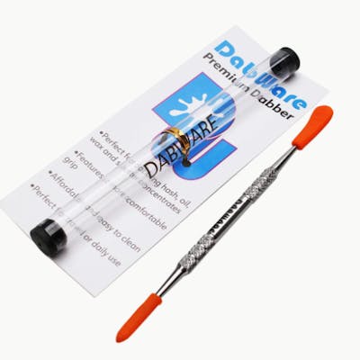 Dabware long 6.5” silver dabber with silicone tips and plastic cylinder storage tube.