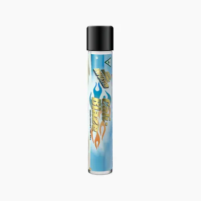 Cali-Blaze’s Tropical Smoothie Infused Pre-Roll packs a punch with 45.02% THC. This sativa-dominant single joint comes housed in a sleek, sky-blue container topped with a black cap, ensuring freshness. This product is ideal for consumers seeking high-potency cannabis in a portable, standout format.