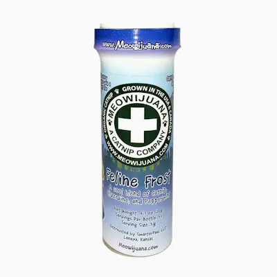 Product Details Your feline lights up your world every day. We agree and wanted to give you a little ’sumthin ’sumthin special just for them. So, we brightened up our organic catnip by mixing it with silvervine and a hint of peppermint. You can light up your kitty's world right meow with this sweet, cool ride they will love. If they could talk, they would say, "Thank you for this 'nip trip of nine lifetimes". Please Note: Our Feline Frost blend has a very small amount of dried peppermint compared to the amount of catnip. Most mint plants contain essential oils which can cause negative responses if consumed in high quantities. In small quantities, they are safe for cats. The majority of the mint poisoning cases (which are extremely rare) occur after cats eat a large amount of mint or are exposed to a high concentration. We recommend everything in moderation. How To Use Stuff a pinch in the pouch on the side of a Meowijuana toy or sprinkle on your cat's favorite bed, scratcher, or the floor and watch them roll around in delight. Ingredients & Servings Contains approximately 52 servings and offers 26 grams of premium catnip (ground), silvervine, and peppermint. Please Note: Our Feline Frost blend has a very small amount of dried peppermint compared to the amount of catnip. Most mint plants contain essential oils which can cause negative responses if consumed in high quantities. In small quantities, they are safe for cats. The majority of the mint poisoning cases (which are extremely rare) occur after cats eat a large amount of mint or are exposed to a high concentration. We recommend everything in moderation.
