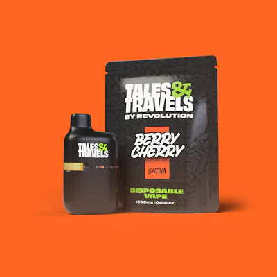 CBD: 0.18% | CBG: 5.04% | CBN: 0.65% | THC: 82.34% | THC9: 82.34% | THCV: 0.27% -- Just the [berry] cherry on top! Berry Cherry is a sweet sativa that keeps the conversation flowing and the adventures going with each puff of fruity flavor. 🍒 Tales & Travels disposables pack juicy flavors into a small-but-mighty package that won't ghost on your good time (hello, rechargeability! 👋). Snagging solid ingredients from our big sis at Revolution, these flavor-fuzed puffs come with the family discount so you can save that cash for snacks. Big taste, bigger vibes, baby price tag! 💸 Tales & Travels is the spunky little sibling of the award-winning Revolution Cannabis. We're affordable, full of character(s), and know how to blend our big sister's expertise into a fun mix of THC goodies - perfect for everyone from the canna-curious to the canna-chronic. WEED got something for everyone. revcanna.com