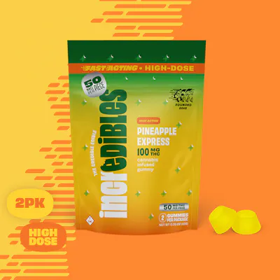 THC: 90.71mg/g | THC9: 9.18mg/g -- All hurry, no worry, 2 pack! Tropical sunshine, delicious juicy pineapple, and a faster onset to match your busy life. Quick, sweet, and to the point, incredibles Fast Acting Pineapple Express gummies are perfect for those in search of a swifter, more balanced edible experience. All aboard! Made with 100% pure cannabis oil in a perfectly blended mixture to ensure accurate dosing and consistency. Perfect for busy schedules and trying new things. -- Featuring a precision-dosed confection collection with yummy flavors, delicious effects and FDA-approved ingredients, you can trust incredibles to be the credible edible. -- Potential effects: Uplifting, mind-elevating -- Serving size: Standard serving is a single gummy (10mg THC). Bag contains 10 gummies for a total of 100mg THC. -- Onset & duration: Onset may take up to 2 hours. Duration can last up to 3+ hours. Effects vary by individual. Estimates are based on a standard serving. -- Contents: Made with pure THC oil and evenly blended for consistency. -- Allergens: Coconut oil. Made in a facility that processes tree nuts, peanuts, milk, soy, and wheat. -- Ingredients: Sugar, glucose, gelatin, sorbitol, contains less than 2% of: natural flavors, citric acid, TiME (proprietary blend of plant-derived modified food starches and gums), sodium hydrogen malate, cannabis extract, turmeric (color) -- Storage: Keep in original sealed container between 60°F - 80°F. Avoid conditions of high humidity and temperature. Keep out of direct light and do not store in hot car. -- Net Weight: 0.35oz (10g)