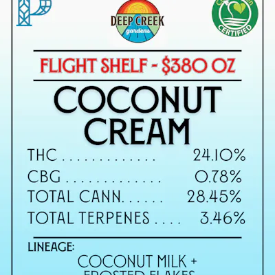Clean Green Certified Grower! Lineage : Coconut Milk x Frosted Flakes Top Terpenes : Caryophyllene, Myrcene, Humulene Effects : Sedative, Psychedelic, Thought Quieting