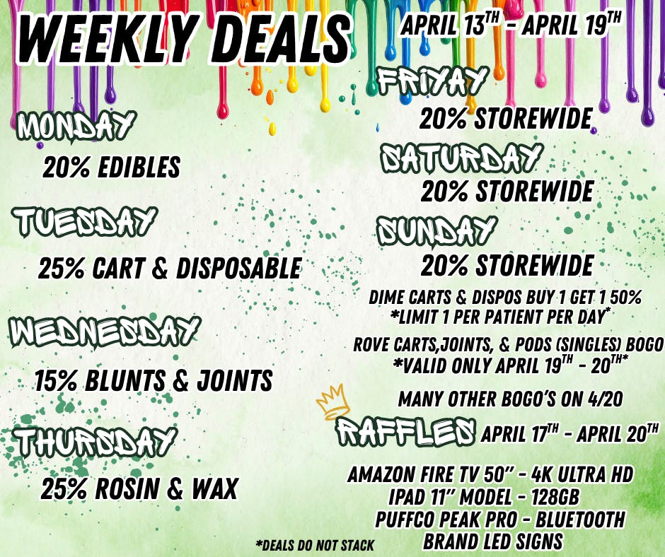 MONDAY: 20% ON EDIBLES *OR BUY 2 GET 1 50%* *EQUAL OR LESSER VALUE