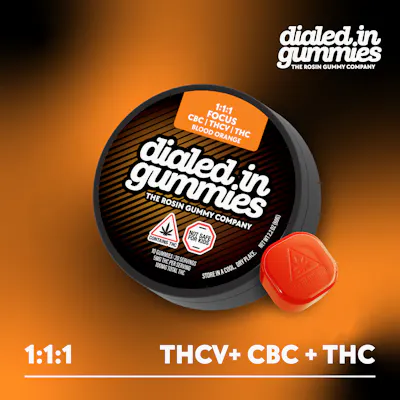 (5mg THC : 5mg THCV : 5mg CBC) Bright and citrusy, these gummies bring together THC, THCV, and CBC in a balanced 1:1:1 ratio—5mg each per piece We started with the best extract possible: full-spectrum solventless rosin, pressed from fresh-frozen flower using nothing but ice, water, pressure, and heat. Then we selected renowned cultivators to bring the best strains from each state into our batches. Every gummy is made in small runs to preserve terpene integrity, paired with intentionally formulated cannabinoid profiles to Dial In specific moods and effects