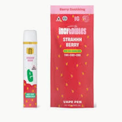 Incredibles Strahhhberry Vape 14:1:1: Incredibles strahhberry vape is a ratio of 14:1:1 . Testing highest in THC, followed by CBG, and CBD, this vape offers a full effect because of this combination of cannabinoids. Not only are the effects dynamic, and soothing, but this vape is infused with hints of berry terpene flavor to add a fruity boost to each cloud.