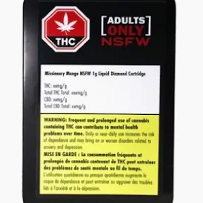 Missionary Mango NSFW Liquid Diamond vapes are brought to you by Adults Only. This indica-dominant, 510-thread vape is packed with insanely potent, liquified THC diamonds that have a sultry sweet and exotic mango flavour. All Adults Only NSFW Liquid Diamond vapes are made using advanced and industry-leading BHO extraction equipment and processes. No added solvents, pigments, fillers, or waxes in this premium extract.