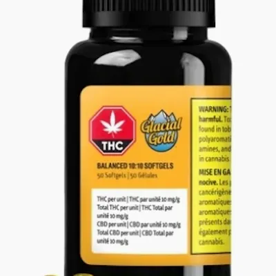 Introducing Balanced 10:10 Softgels 50-pack containing a total of 500mg of THC and 500mg of CBD. Glacial Gold Balanced 10:10 Softgels are made with organic MCT oil from coconuts and high-purity distillates from Nextleaf Labs