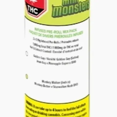 Double the Monsters, half the size – introducing Mini Monsters Infused Pre-Rolls Mix Pack. They took the Monsters Infused Pre-Rolls and shrunk them into two mini-but-mighty versions. This two-pack delivers a monstrous 1,000mg of THC into two 42% THC 1.19g infused pre-rolls. The Mini Monsters mashup includes; Golden Guy: A sativa powerhouse forged from Jean Guy milled flower and Pineapple Express BHO. Monkey Walker: An indica beast, blending Monkey Butter milled flower and Starwalker Kush BHO. Each Mini Monster is made with strain-specific, hang-dried milled flower, before being infused with strain-specific BHO and expertly rolled, coated in distillate and kief. Two ferocious strain mashups, one monstrous mix pack.