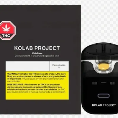Kolab Project's proprietary AIO vape combines state-of-the-art technology with novel and convenient design. Kolab's device is rechargeable, uses a blue ceramic coil, and offers dual-heat settings to guarantee a carefully crafted experience. White Grape Diamonds AIO uses a hydrocarbon-extracted liquid diamonds base blended with botanical terpenes to deliver a light grape and floral finish on the exhale. Embrace the unexpected with Kolab Project.