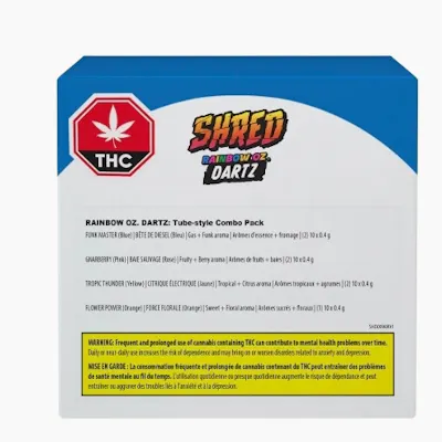Blaze the Rainbow, with SHRED Dartz Rainbow Oz. This bulk pre-roll mixer pack contains seven (7) 10-packs of 0.4g pre-rolls of the most popular SHRED blends, expertly rolled in 100% organic hemp paper, for an incredibly smooth and flavourful sesh. The whole gang is in this one pack, and then some! Two (2) packs each of Tropic Thunder, Gnarberry, and Funk Master – and one (1) pack of Dessert Storm for good measure. Try all of the best-selling SHRED blends in one convenient Rainbow Oz. of Dartz.