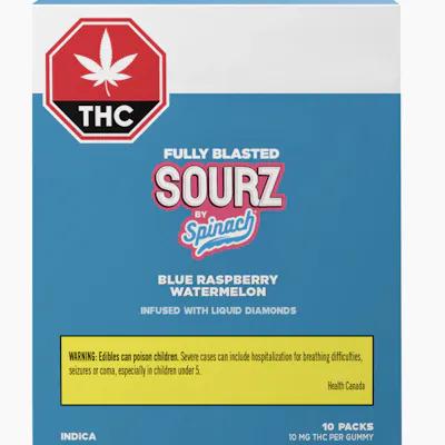SOURZ by Spinach® Fully Blasted Blue Raspberry Watermelon gummies have 10mg of THC per piece. These dual-flavoured gummies are over-the-top with natural flavours and blasted with sour crystals. Enjoy 10 gummies with 10mg of THC per gummy and 100mg of THC total per pack.